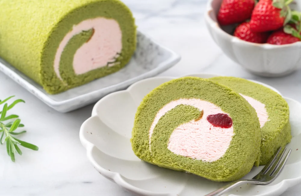 เค้กโรลรสชาเขียวใช้สูตรพื้นฐานเดียวกับรสวานิลลา แต่เพิ่มผงมัทฉะเกรดพรีเมียม 15 กรัมลงในแป้ง จากนั้นร่อนให้เข้ากัน ซึ่งการใช้มัทฉะคุณภาพดีจะทำให้ได้สีเขียวสวย และกลิ่นหอมเป็นธรรมชาติ ไม่จำเป็นต้องใช้สีผสมอาหาร