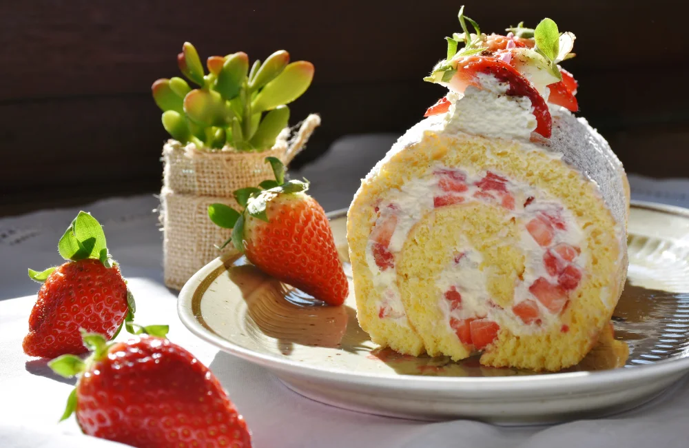 ใช้สูตรเค้กวานิลลาพื้นฐาน แต่เพิ่มกลิ่นสตรอว์เบอร์รี่ 1 ช้อนชา และสีชมพูอ่อนเล็กน้อย ระหว่างม้วนให้วางสตรอว์เบอร์รี่สดหั่นชิ้นบาง ๆ เรียงไว้บนครีม ก็จะได้เค้กโรลที่มีชิ้นผลไม้สดแทรกอยู่