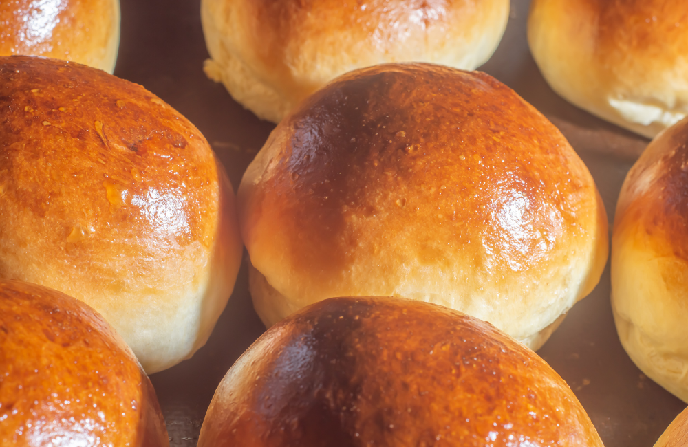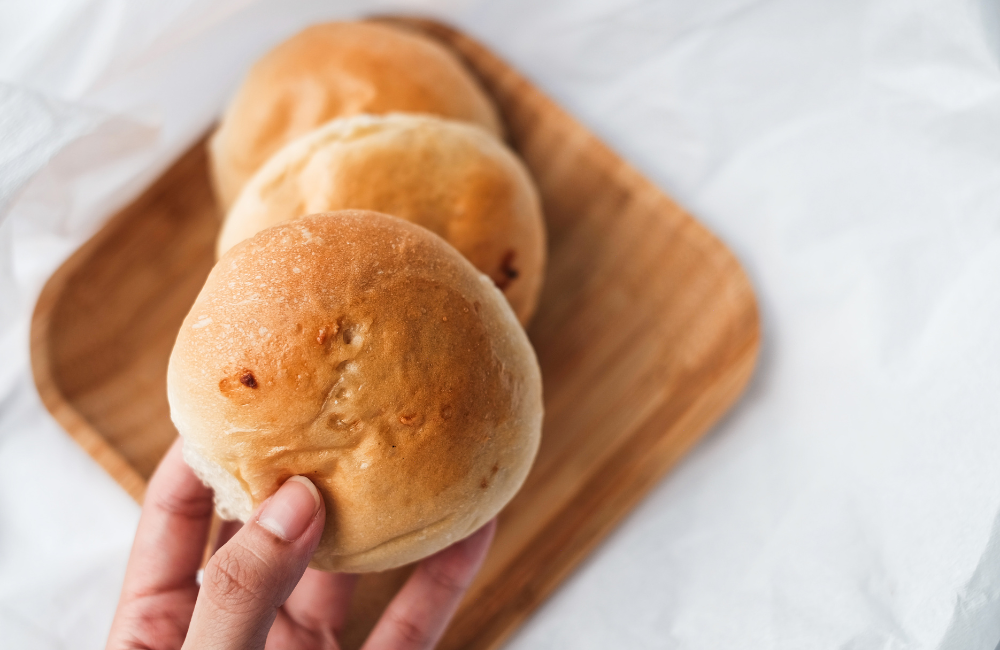 อุ่นเตาอบที่อุณหภูมิ 180 องศาเซลเซียส ประมาณ 15 นาที นำขนมปังเข้าอบด้วยไฟบนไฟล่าง เป็นเวลา 18-20 นาที หรือจนหน้าขนมปังมีสีเหลืองทองสวยและสุกทั่ว ระหว่างอบให้สังเกตสีหน้าขนมปัง หากเริ่มเข้มเกินไปก่อนเวลา ให้คลุมด้วยฟอยล์อลูมิเนียมเบาๆ เมื่ออบเสร็จแล้ว นำออกจากเตาอบ ทาหน้าขนมปังด้วยเนยสดหรือนมสดเบาๆ เพื่อเพิ่มความเงางามและป้องกันการแห้ง พักให้เย็นลงเล็กน้อยก่อนรับประทาน