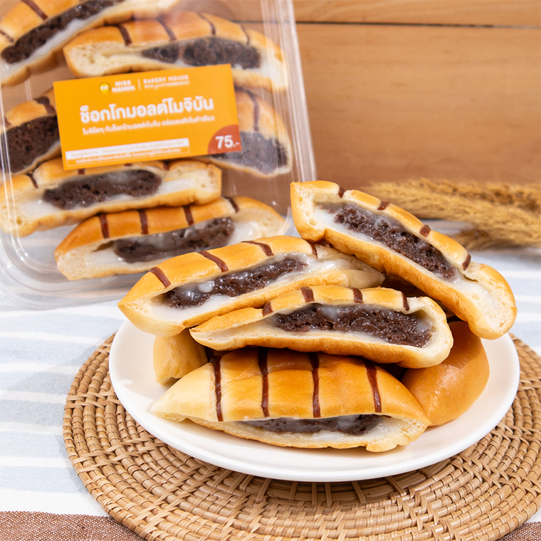 มาต่อกันด้วย “ขนมปังโมจิไส้ช็อกโกแลต” เมนูแม่เหล็กที่ใช้ดึงดูดกลุ่มลูกค้าได้ทุกเพศทุกวัย เป็นเมนูที่ขาดไปไม่ได้โดยเด็ดขาด เพราะเบเกอรี่ที่มีส่วนผสมของช็อกโกแลต มักจะเป็นสินค้าที่มียอดขายมาเป็นอันดับ 1 อยู่เสมอ เนื่องจากเป็นรสชาติสากลที่เข้าถึงได้ง่าย จุดเด่นคือเมื่อกัดทะลุแป้งเหนียวหนึบทางด้านนอก ก็จะพบกับไส้ช็อกโกแลตมอลต์แบบเต็มปากเต็มคำ ตัวไส้มีความหอมช็อกโกแลตอันเป็นเอกลักษณ์ และยังเป็นแบบหวานน้อย ถูกใจผู้ที่ดูแลสุขภาพอย่างแน่นอน